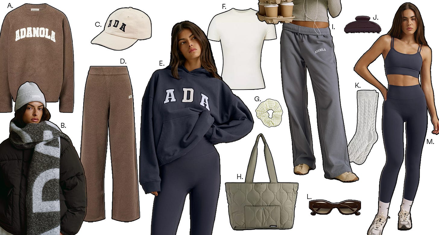 A. Adanola Varsity Boucle Oversized Knit Sweatshirt, $115 B. Knit Scarf, $75 C. ADA Cap, $34 D. Varsity Knit Straight Leg Sweatpants, $105 E. ADA Oversized Hoodie, $100 F. Round-neck Slim-fit Stretch-cotton T-shirt, $42 G. Gingham Scrunchie, $16 H. Quilted Nylon Tote Bag, $60 I. Varsity Loose Fit Straight Leg Sweatpants, $90 J. Large Claw Clip, $22 K. Branded Cable-Knitted Socks, $21.50 L. Adanola Adanola x Lexxola: Coffee Bean, $150 M. Ultimate Leggings, $65